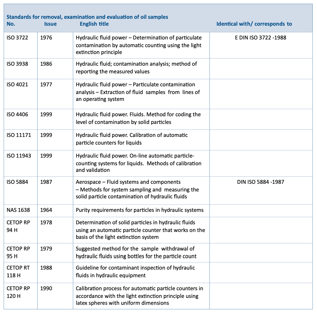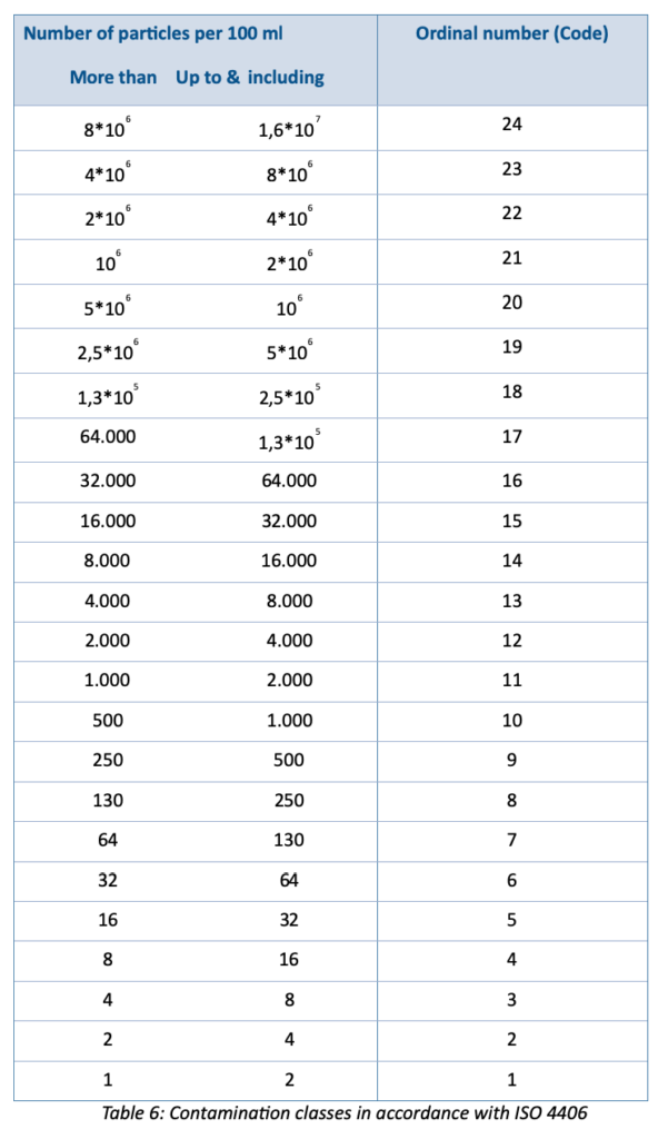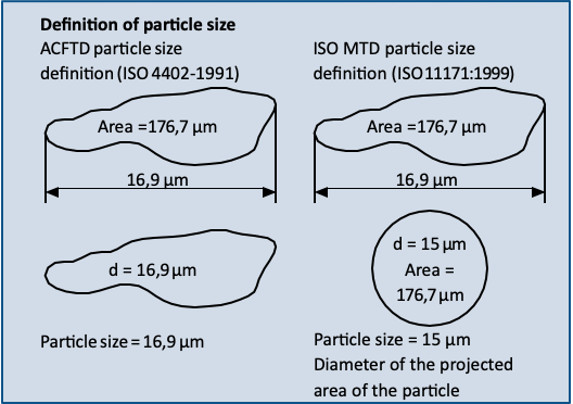 For industrial hydraulic systems, particle counts are coded in accordance with ISO 4406. With replacement of the ACFTD test dust through ISO MTD, the particle sizes have also beenredefined.