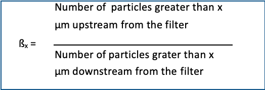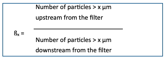 The ßx value is determined as the measure of the effectiveness of a filter in the multipass test. It isa ratio that is calculated from the particle count before and after filterpassage.