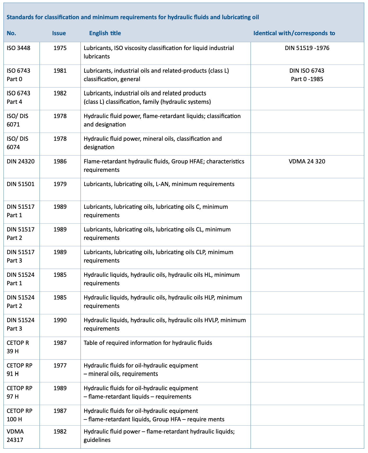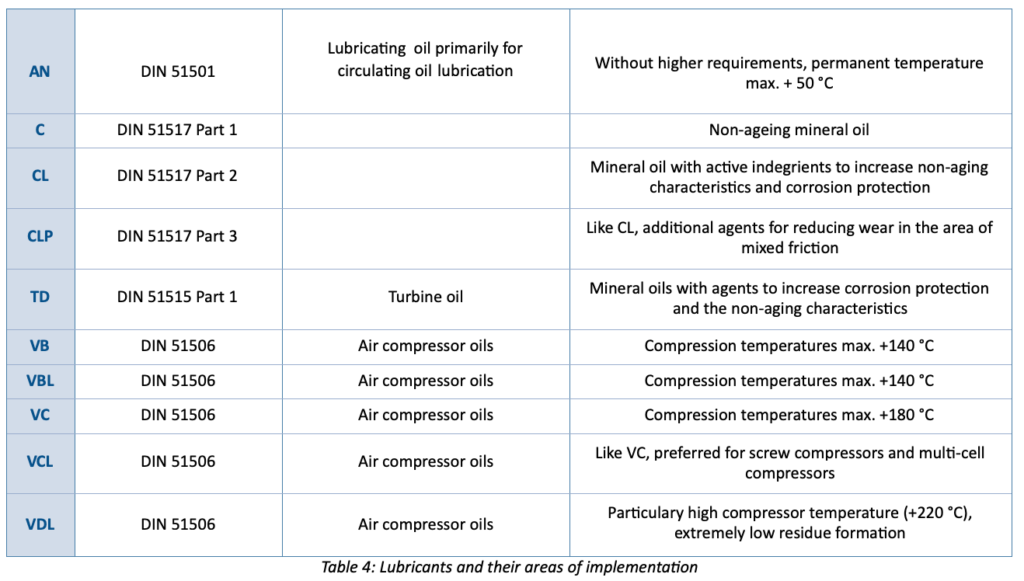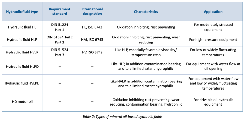 In hydraulic and lubricating equipment, mineral oils are used predominantly because their characteristics relative to aging, corrosion protection, temperature influence on their viscosity, lubricating behavior and water bearing capacity can be improved by introducing additives to a base oil. Mineral hydraulic fluids are classified in different quality groups in accordance with DIN 51524 (Table 2) depending on the requirement.
