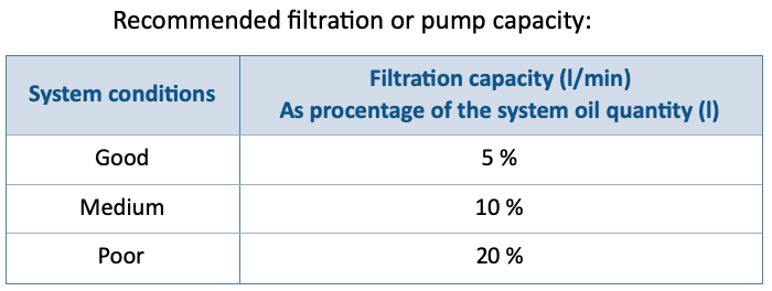 Arrangement of the filter in a circuit that is separated from the main system and that is fitted with its own pump. Bypass filtration through a precisely specified filter can occur independently of the operating time of the equipment, until the desired contamination class isachieved.